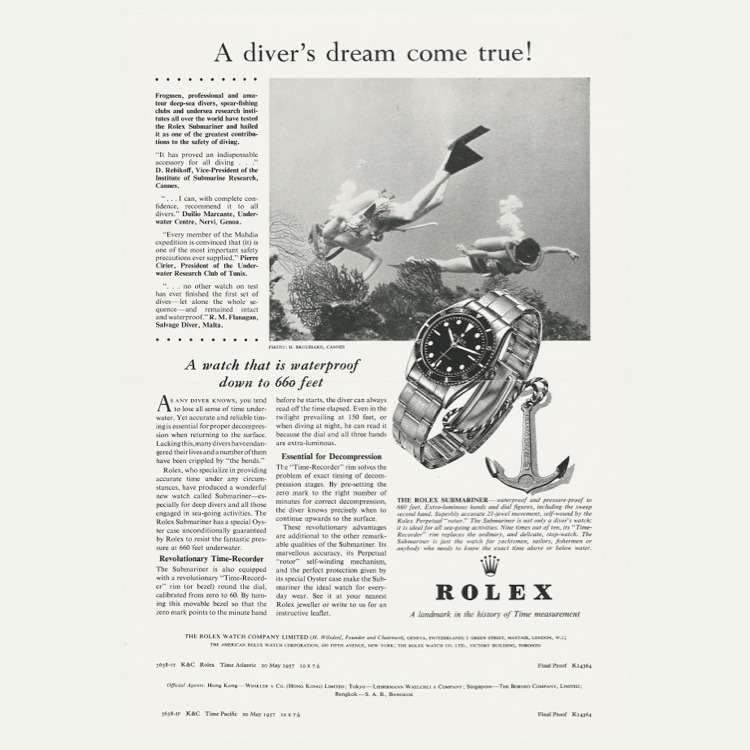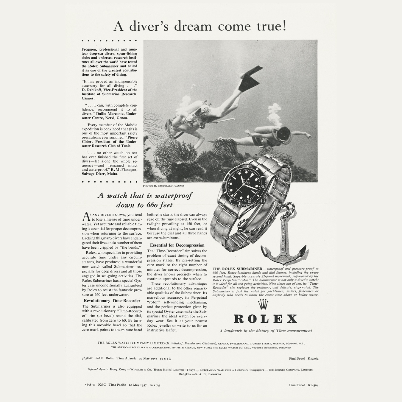 The Submariner was created specifically for underwater exploration and diving. When it first came out of the Rolex workshops, the watch was an immediate success with many pioneering deep-sea professionals, who were asked to test it. One of those trailblazers was Dimitri Rebikoff, a French engineer and underwater photographer.